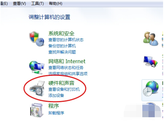 2.在弹出的对话框中,单击“硬件和声音”选项以进入下一级页面;