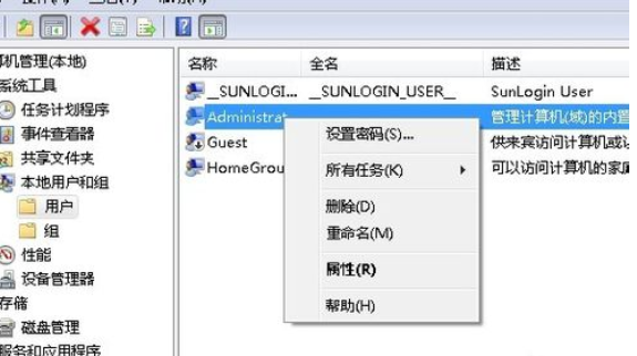 2,在左边选择本地用户和组–用户—在右边我们看到有一个administrator